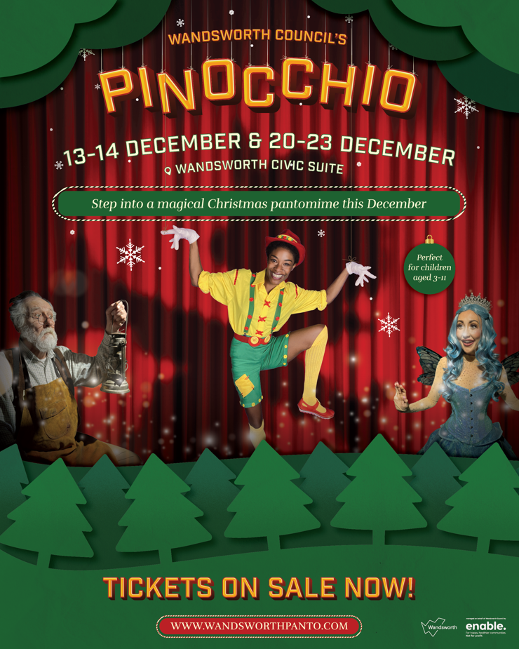 Step into the magic this Christmas as Wandsworth Council brings the timeless tale of Pinocchio to life on stage at the Wandsworth Civic Suite! Follow the mischievous wooden puppet on his whirlwind adventure as he learns the importance of honesty, courage, and friendship.  The heart-warming show promises laughter, music, dancing, and plenty of festive fun for all!